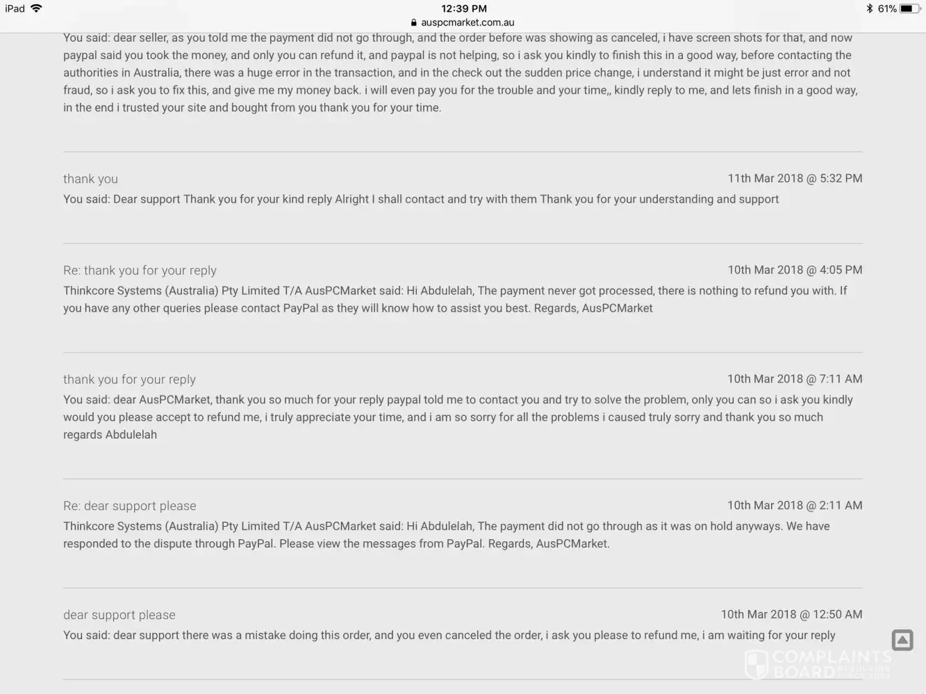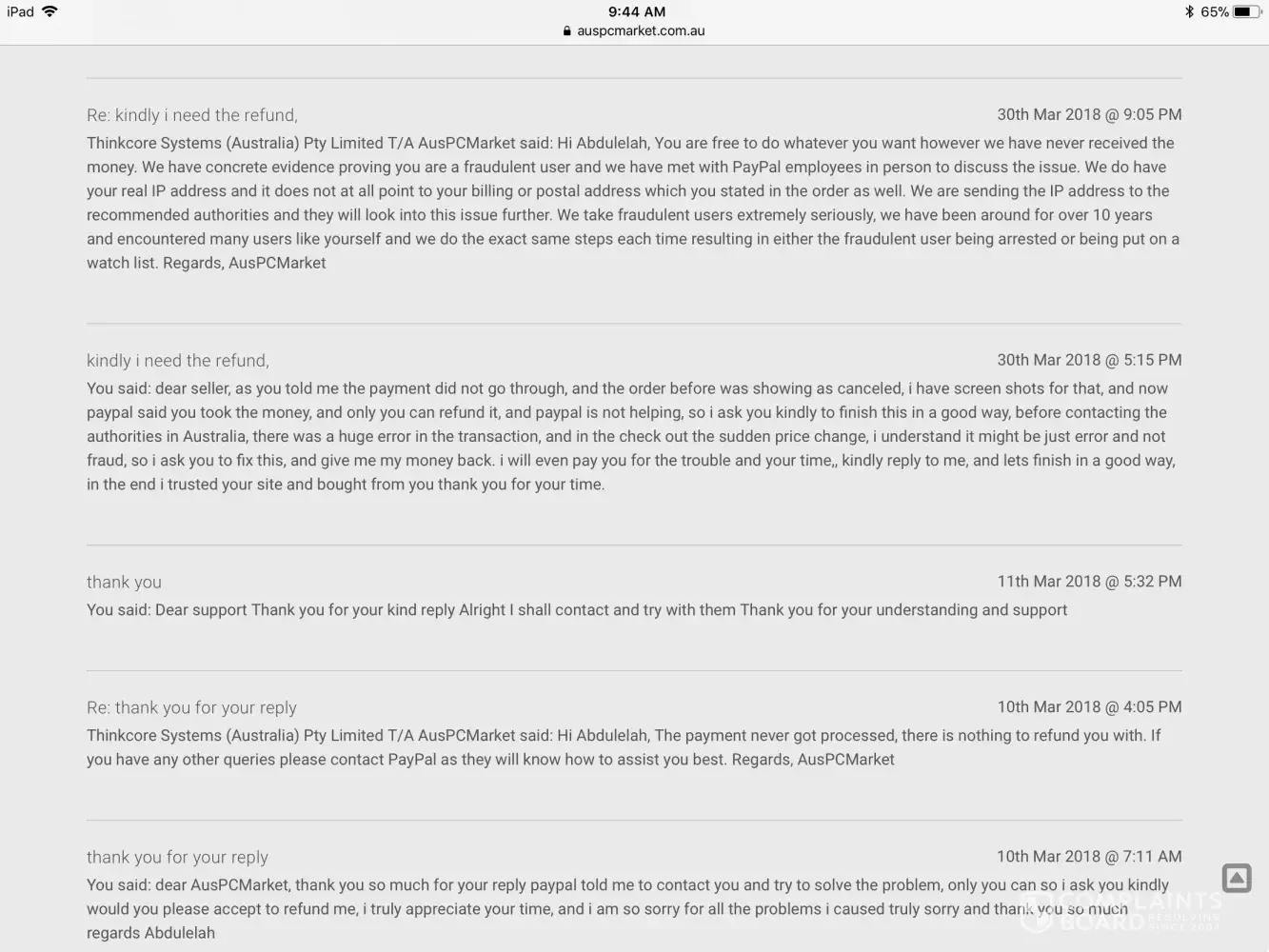AusPCMarket Australia / Thinkcore Systems complaints: history and resolution overview