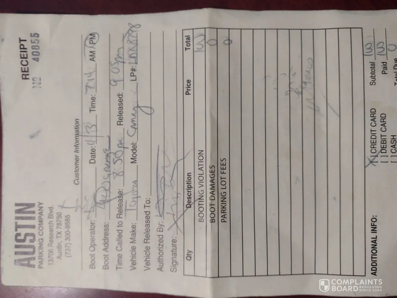 Date/time of booting: 9/24/2022 at 12:32 am Location: an unspecified street parking lot. I was visiting Austin for my bachelorette. When we arrived, a man in a work vest requested $20 for parking, giving us a slip for our dashboard. After parking and returning later, we found a boot on our van's wheel. Calling the number provided, we were informed we'd been scammed by a non-employee. Despite paying the official boot removal fee of $130 to two men who arrived later, their response to our confusion was discriminatory. The lot had signs warning against cash payments and QR codes for legitimate transactions, but they weren't visible from every spot. The company's contact details seemed dubious. We had no intention of violating parking rules and felt deceived by the entire situation.
