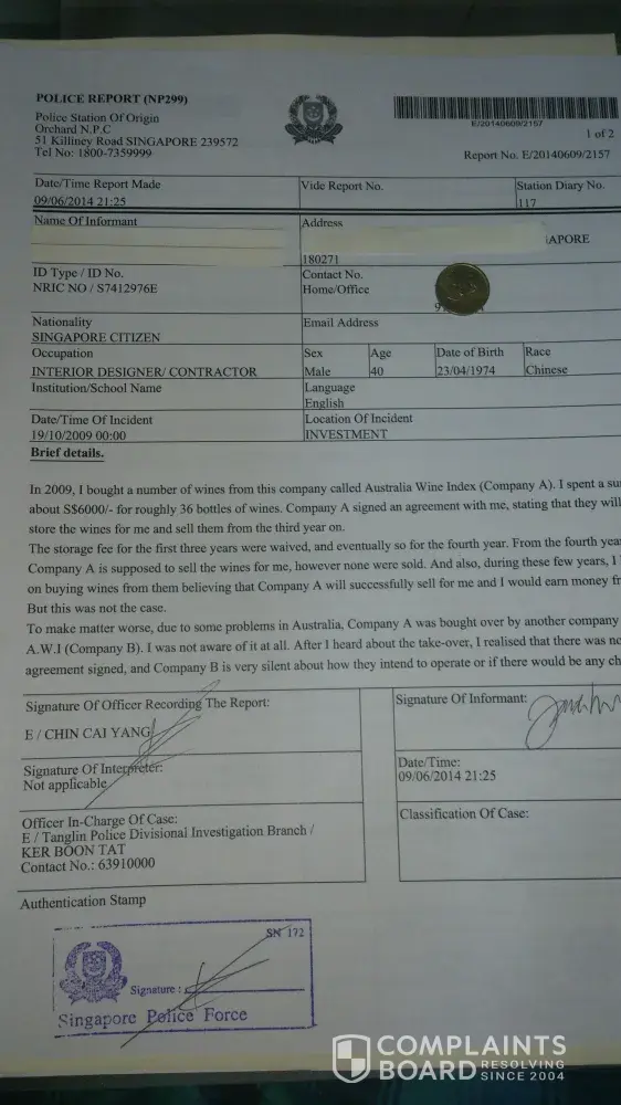 To all angry victims, I also bought the wines about 5 years ago after pestering from one of the sales persons by the name of Alvin. He promised me that it can be sold on the 3rd year at good profit. Now already 5th year, they still didn’t sell and now asked me to pay few thousands to just help me to sell my wine. If they can’t sell in 3 years, what makes you think they can sell within a year? If I refuse to pay, they will either force me to take out the wine, pay all the taxes and other costs amounting to a few thousand dollars, or risked being confiscated. This is crap as I believe they will be doing the same to others as well soon. I’m gathering other victims to lodge Police report. Mass report in the same Police station will be effective. Any other reader can contact me at rtsw169@gmail.com.