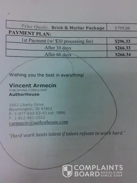 I have paid for a pinacle package 1 year ago that I was told would include 50 colored photos at no extra cost. Not true I find out today. I get 10 black and white at a cost of 5.00 each. And I had also found out that I have to pay an additional 1100.00 to 1500.00 for advertising. I am going with Exlibrus who offers me a great deal, a half price package with no additional cost for advertising and unlimited black and white photos. and the royalties are 50%. Well my main complaint is that I have not signed a contract with authorhouse. I have only a book id number and an author id number. I was told prior I would get a refund if I chose not to publish, rather changed my mind which I did. Now my newly appointed consultant Branden Drake tells me I receive no money back. I reminded him that his company has done NO WORK ON MY BOOK. He then told me to discuss the matter with my original consultant who is Mr. Gerry Shyrock. I left him a message and I hope that I can write him a great review. If not I will hound them and contact the better business beareau in Indiana.