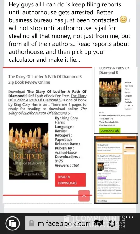 Hello, i want authorhouse/iuniverse. Why is the complaints board advertising for self pub companies. I have solid evidence. Since i posted a last week a class action law-suit has been initiated. Is it real please check out the law firm this could be a tick from authorhouse. Now if it is join me there is a 2 year statute of limitastions. I have prof they are still selling my book if you are sincere and not one of there flunky's trying to derail my efforts i will tell you where to go and under what company they ayre illegally selling my book... Contact me @ [protected]@msn.com