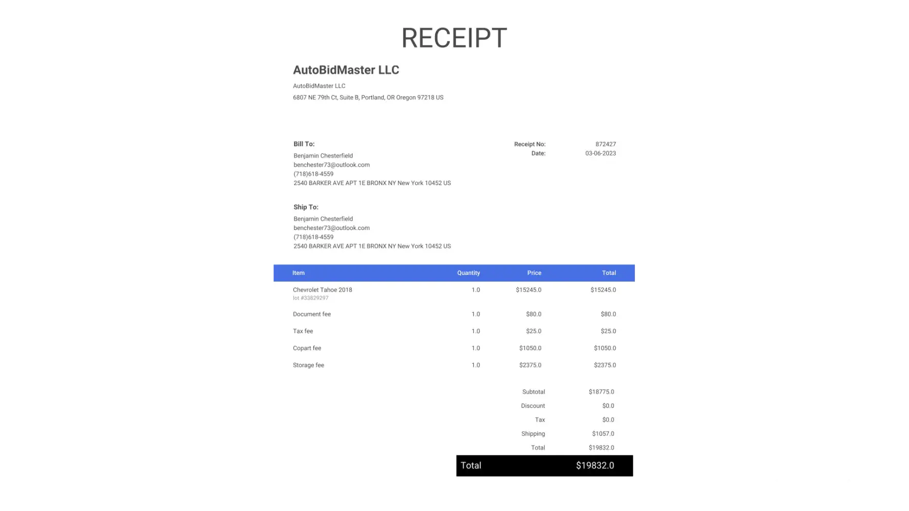 All went good until I paid them to ship 2 of them in a warehouse they ship with their own company called EASYHAUL and I give the AutoBidMaster clear instructions to call 2-3 days in advance for an appointment to warehouse which they did not and when they tried to deliver obviously the warehouse didn’t accept the vehicle and now the autobidmaster send me an invoice and an email that says I get charged 600 for dry run and 25$ each day for storage until I pay and they keep me vehicle hostage and they want me to pay the trucker 600$ fine because THEY DID NOT DO THEIR JOB CORRECTLY I paid them and give them instructions simple and clear they only care about charge your account nothing else run away buy direct from COPART.