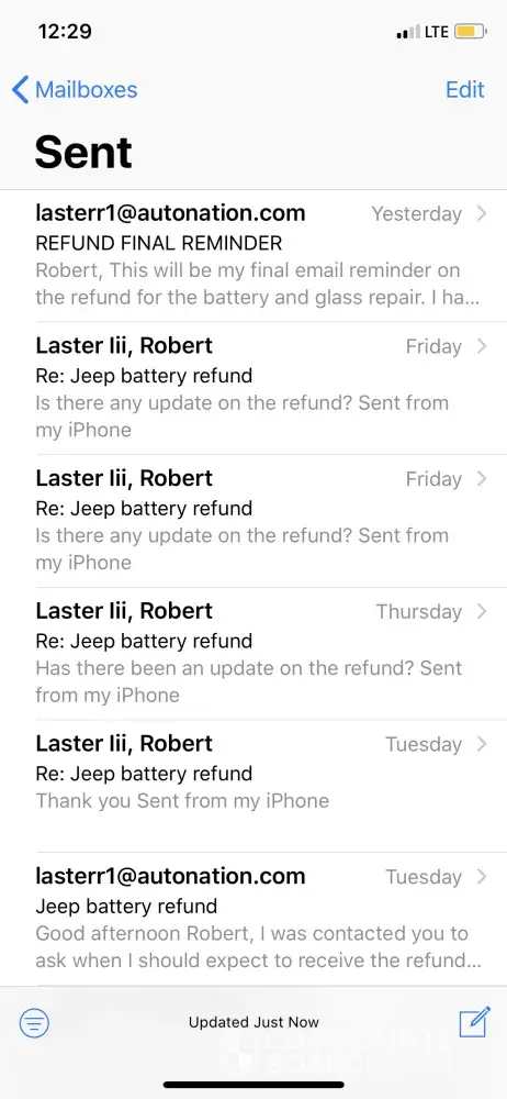 Now I have been waiting almost a month for them to send me the refund money for the battery and glass repair! I have sent multiple emails to Robert, the last one I heard from him was last Tuesday and he assured me he would have a answer for me first thing the next morning. Since then I have sent FOUR additional emails asking for an update and have not received a response. I also have been asking for a CARFAX report so I can see what maintenance has been conducted on the vehicle. This is my last resort to get the refund I was promised and am now impatiently waiting on. I am absolutely appalled at the level of customer service coming from this Autonation and cannot believe they are allowed to operate in such a manner and still keep their jobs! I cannot be the only one suffering from their lack of attention and eagerness to take care of their customers. I'm frustrated, angry, and very very irritated at this entire situation and how my first car buying experience has gone SO poorly from start to finish.