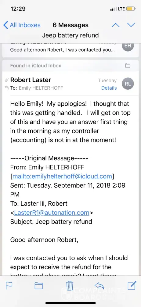 My name is Emily Helterhoff. I purchased a 2015 Jeep Wrangler Unlimited Sport from Autonation Hyundai on August 17th. This is now the second complaint I am making, because after the first complaint I was promised a refund for the battery that I had to replace that was $200. When I purchased the vehicle, there was a chip in the windshield that was promised to be payed for to fix as well. That was documented in the paper work. Robert Laster contacted me after my first complaint and asked that I send the receipt for the battery and the glass repair, which I did. On 8/22/18 I sent him the battery receipt, and on 8/28/18 I sent him the glass repair receipt.