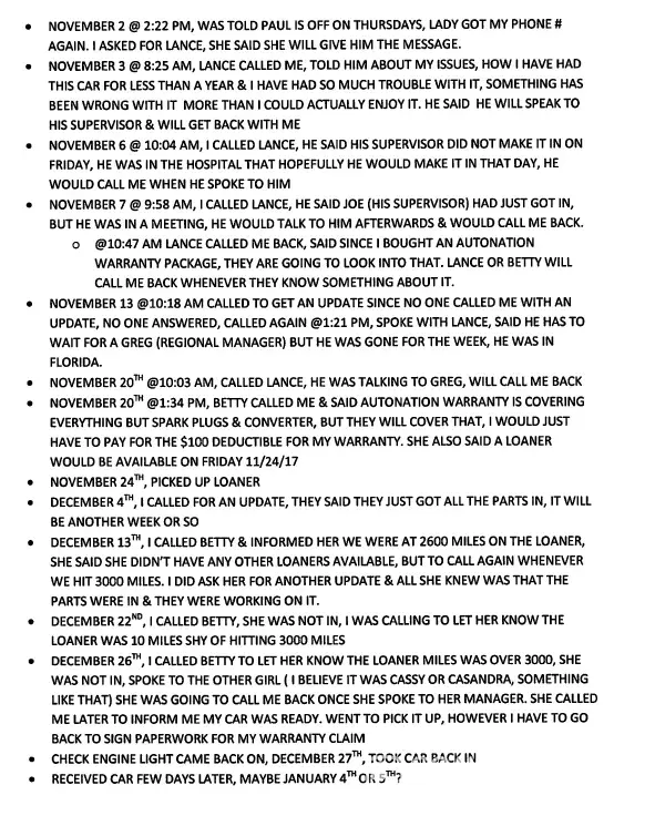 I have had so much trouble with my vehicle. Autonation in Ennis was recently bought by a different dealership. From what I have heard, (could be rumors), the used cars that they had were replaced because they were all bad cars. I can only imagine since I purchased a used car from there with so many problems. I'm attaching a rough draft of an outline that I have been through, I started doing this in October, so anything before that is kind of an ideal dates but close to those dates. I stopped doing it on Dec 26th. So anything after that is ideal dates as well. I only have call records & an invoice from the 2nd to last time I took it in.