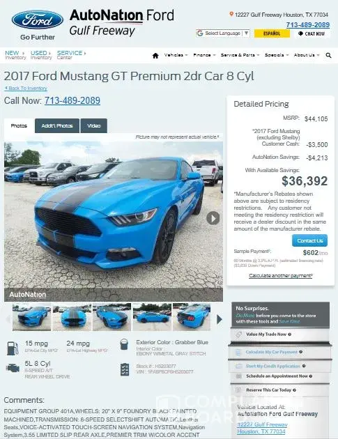 Due to Houston’s disaster Hurricane Harvey the insured 2017 Mustang GT-Premium is documented and finalized as a total loss along with my home. Hence, as I rebuild my life, On Thursday Sept. 7, I began dealing with Auto Nation to purchase another 2017 Mustang Premium based on the web advertisement (36, 392). (Images attached)