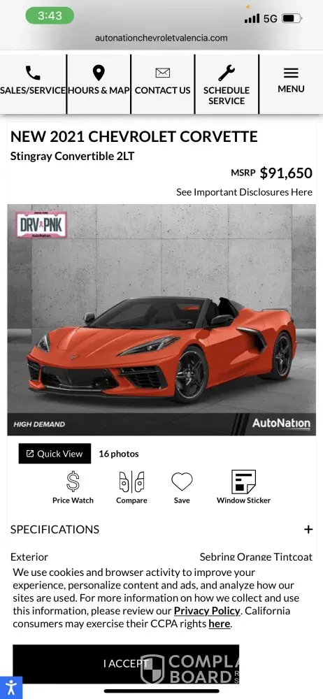 Tried to buy 2021 Chevy Corvette c8 at this dealership, filled a credit app, submitted, checked all disclosures before that(dealer price $91k). After I submitted I had a chance to speak with manager, gm, all of them said vehicle has markup $30k on top of msrp, and that's the way how they do business. When you press on disclosure it doesn't say anything...