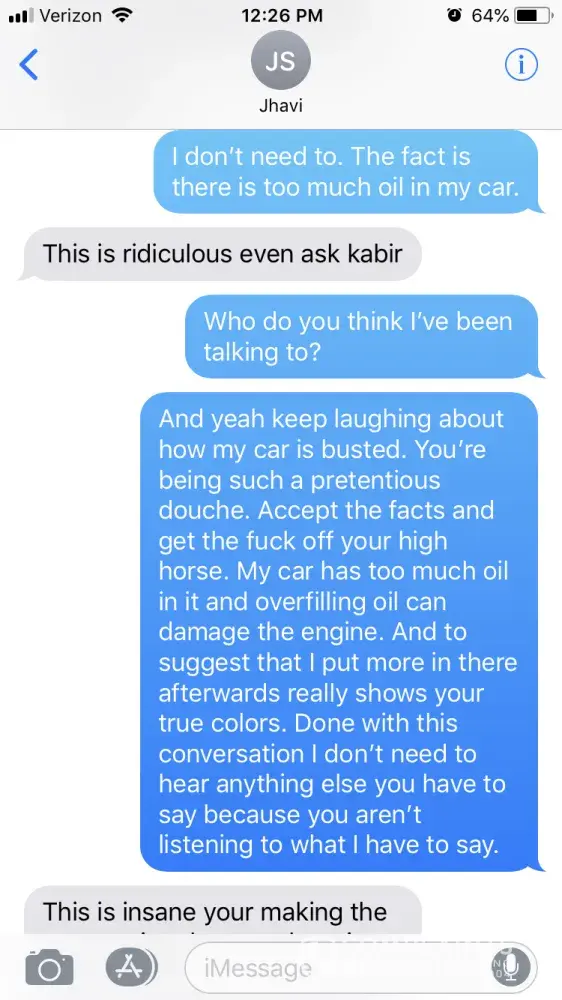 An employee at an auto zone store on East Market Street in Leesburg, Virginia offered his help to me two sundays ago in changing my oil and replacing my oil filter before I went back to school at William & Mary. After leaving the oil change performed solely by Mr. Schatz I noticed a char or almost burning smell when I turned my car on which I wrote off as being part of the 50-100 miles he recommend I run the car to lubricate the engine. Upon getting to school almost 200 miles later the problem was still there so I called my brother-in law who is a mechanic who said to check my fluids when I noticed I was massively overfilled with oil. I had texted Mr. Schatz about it to which I was met with an intensely defensive posturing, name calling, blame and public lies to my peers. I have attached screenshots of our message conversations as well as the dipstick reading and wholeheartedly do not believe autozone believes the manner in which I was dealt with was professional, warranted, or mature. For my character to be attacked by an employee due to me bringing up a specific issue about my vehicle that he had worked on is wholly unacceptable. I hope I can speak with someone further about this and ensure that this isn't the kind of employee you want representing your company.