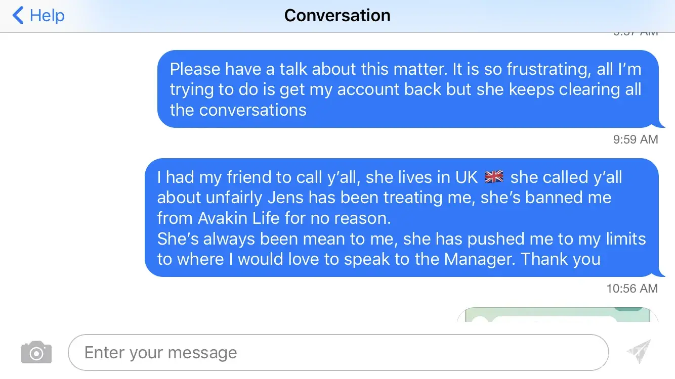 I also put this everywhere I put this on @AvakinOfficial (Facebook, Twitter, and Instagram) She made me cry 😓 my grandma is ill and I've been trying to save money to pay for her medication 😓 Jens also cleared all of my conversations with lkwd because she doesnt want the lkwd team to see them. See? All of the other lkwd members are nice towards me. I kept trying to email yall support on different email addresses but jens keeps deleting the email so yall would not see them, im at the point where I try to find the manager of avakin life and tell him or her about this matter. Thank you lkwd