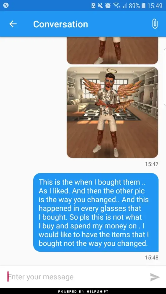 Im a user of Avakin life for over 6 months I spent alot of money on game. Buying avacoins to buy items in the shop. I bought some glasses and a few days after I buy them all my glasses collection they look different. It's not what I bought. I contact avakin support they answer me with some tips I tried them all nothing work. Since then I've been 1 week waiting for they contact me to fix the issue. I still don't have answer. This is not support to the users. I feel unfair as I spent alot of money in the game. And I buy something that they made changes in those items. That is not fair and not meet the agreement. It's my money they cannot change something just like that. Or they should refund me for all the items that been changed. I feel unfair and I would like help. There's some screenshots of when I bought them you can see through the lenses my eyes. Then the screenshot to when they change. And that happened in each everyone of my glasses.