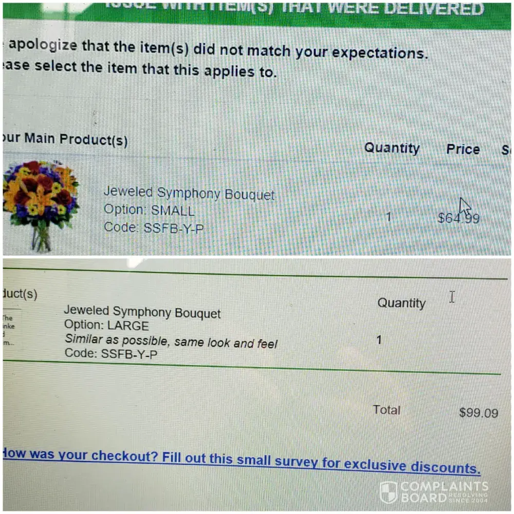 i paid $99.09 (large)and you sent a $64.99 (small) arrangement.
