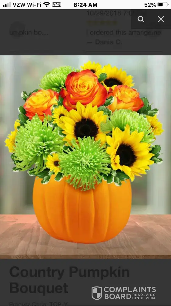 I ordered a Country Pumpkin Bouquet for almost $100. What was delivered was a bouquet of "greens" with a splattering of very small flowers. Nothing about it looks like what I ordered! When I call to complain, they offered to refund $20.