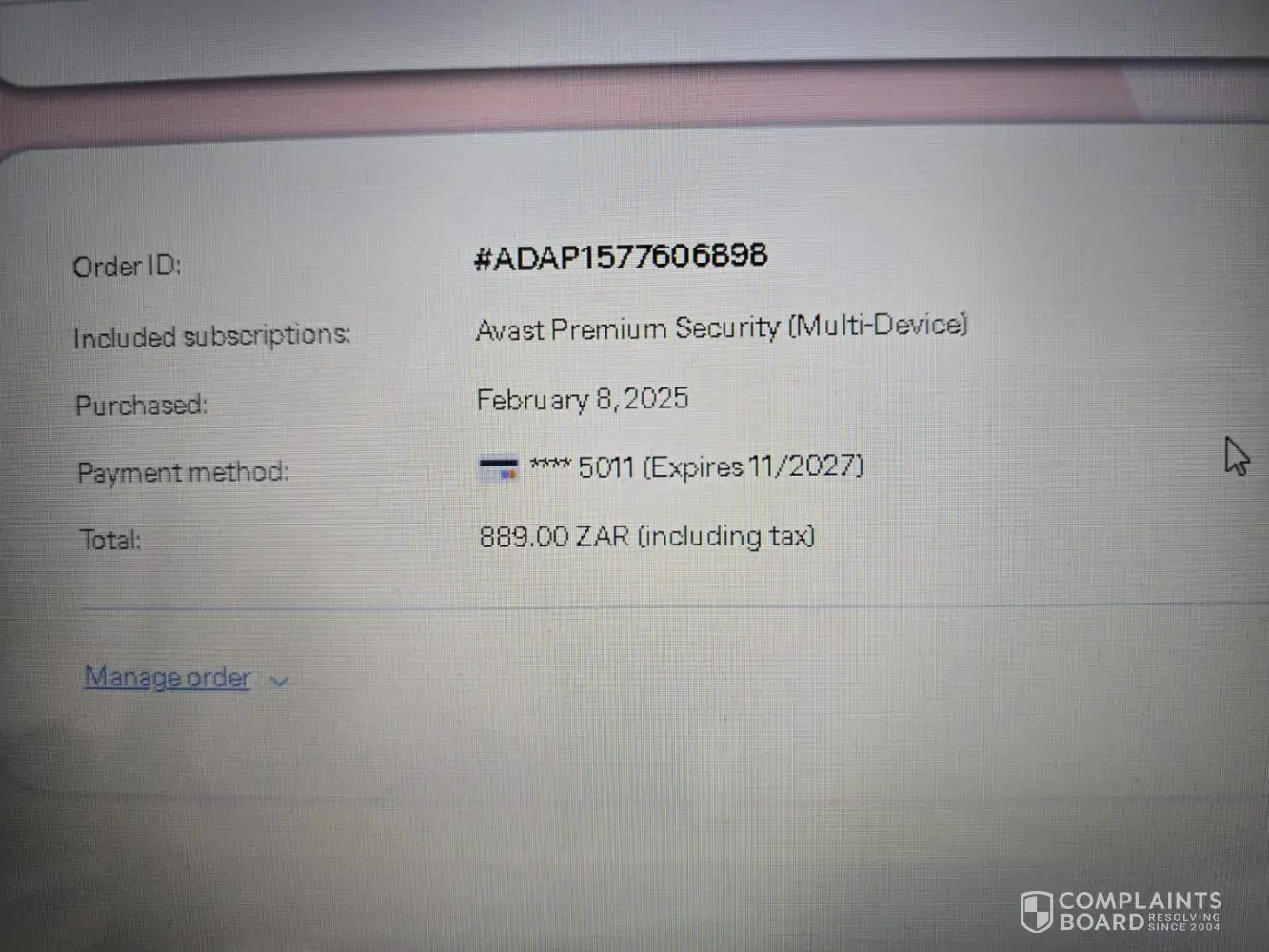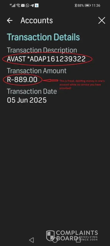Claimed loss: I notice a debit of the amount of R889 in my bank account. A reference number for the debit is Avast*ADAP160239322. It was done on 5th June 2025. When I check on the system it lokks like you will debit again in July.
