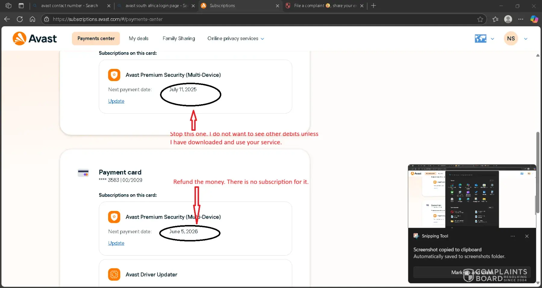 Many platforms, people internationally complaining about Avast renewing or charging double for the same products, without any consent., as abovementioned. I went on the Avast site, what an unfriendly site keeps reverting me back, can't obtain any e-mail to forward my complaint to Avast. It seems Avast site is intentionally rigged to make it difficult to contact the correct people for a refund or to report criminal activities inside Avast. I battled cancelling my credit card renewal which seems to be done automatically by your sly system. I even lost many days on my previous subscriptions. I have never selected automatic renewal, I will decide on when to renew. Avast is acting criminally, and I feel this matter must be reported to the INTERPOL office in my country. If Avast ignores my pleas, I will have to proceed with criminal dossier to INTERPOL and contact all media platforms to warn people about Avast criminal behaviour. It is what it is namely Fraud.