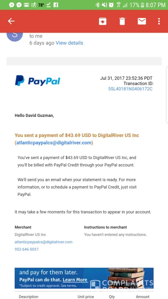 On july 31, I showed a pre-approved payment withdrawals from my PayPal credit that I never authorized in the amount of $43.69. Please refund the amount and send receipt/conformation of completion. The charge came from dri*avast software from merchant DigitalRiver US inc.