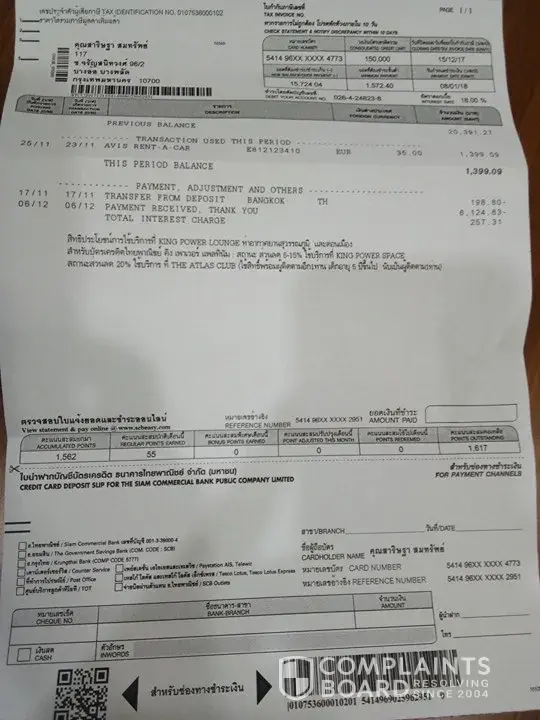 I received my statement from my bank scb thailand that marked that avis rent a car e812123410 amount 35 euros =1, 399.09 baht. As the photo attachement.