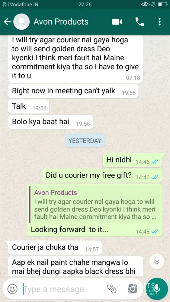 Hi.. This is Bhavya Gangwani from delhi(India)I had a very bad experience with an Avon dealer named Nidhi khanna( delhi-India). She is so annoying... She made fake promise to deliver free gift (Deo) with a purchase above 3000inr...