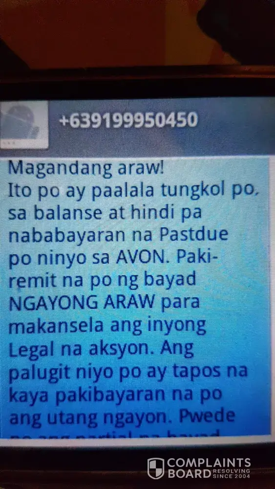 We received a text from avon for the first time, reminding my mom to pay for the past due, so they will cancel any legal action. My mom paid alreasy the amount to her dealer/manager nielde. So we asked her, what other possible charges that we failed to pay, she said, maybe its the penalty, amounting p169.00 only? And the term is legal action? That her dealer / manager, didnt ever remind her that she still has payment. She paid thousands for the products, not to brag, but this? How dare them giving my mom a warning and using wrong term "legal action"! Hoping for you immediate response on my complaint. Thank you for your time.