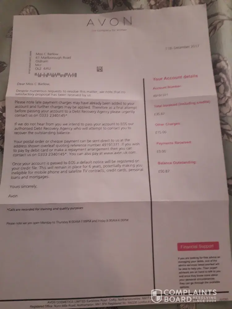 I have recently started getting harassed by letters stating I owe £35.87 and now these so called charges have risen to £50.87. I don't owe anything to Avon and I have never ordered from Avon. I feel like I am being threatened with these letters, especially when they don't state what these charges are for. I have tried various times to get in contact with no reply. Since I am only an apprentice, I don't get a lot of money as it is and these letters make everything worse. As I work full time, I cannot ring during the office hours so the only way I can correspond is by email or letter.