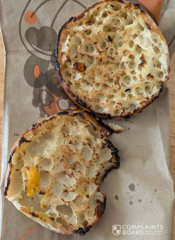 September 17, 2025 at Powell River, BC V8A 3B6 about 4:30 pm I ordered an English Muffin Bacon & Egger to go. After coming home, I found a seriously over-toasted muffin placed inside. The whole circle rims of both halves were totally burned black, one of the half’s edges was even fragmentary and the inner surface of those halves were filled with many...
