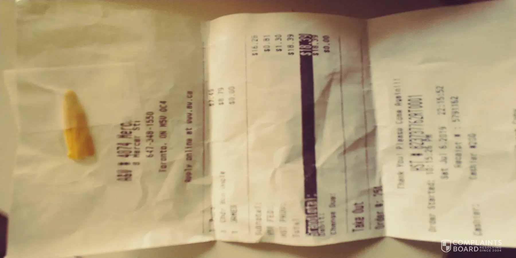 On Saturday June/06/2019, (9:15 PM) at A&W Mercer Street Toronto. I order a uncle burger, papa burger, took it home to eat. The wife had papa and I had the uncle burger. I started to eat my uncle burger, I pull out of the burger a piece of wood chip, the wood chip was less the 1 inch x 1/4, that was very surprising to me.