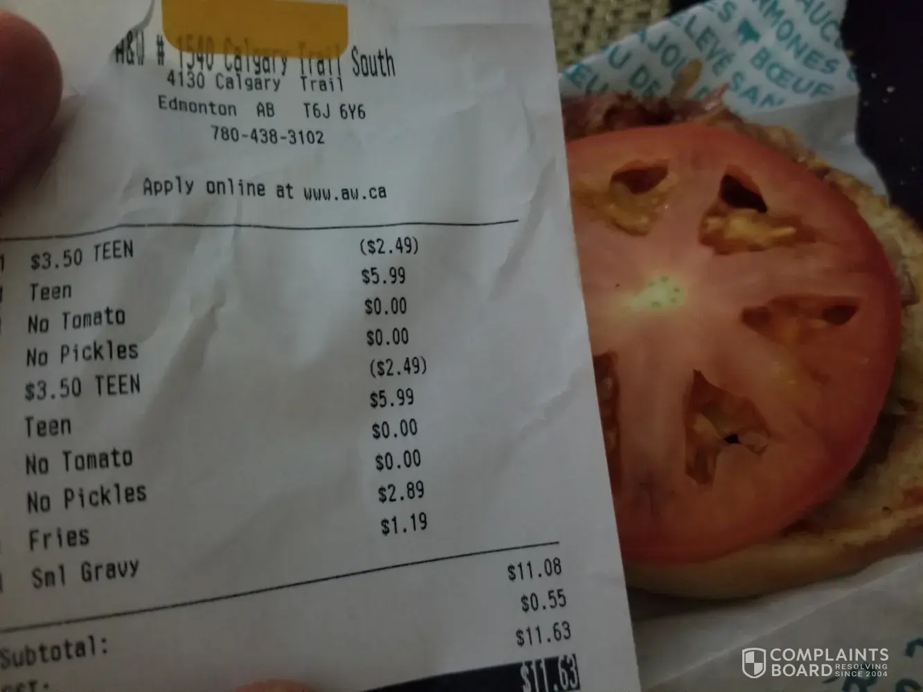 Sunday Sept 23rd at 12:30am I went to the drive thru at 4130 Calgary trail in Edmonton Alberta and bought 2 Teen burgers and asked for no pickles or tomatoes on both, when I got home I found out both had tomatoes and pickles.