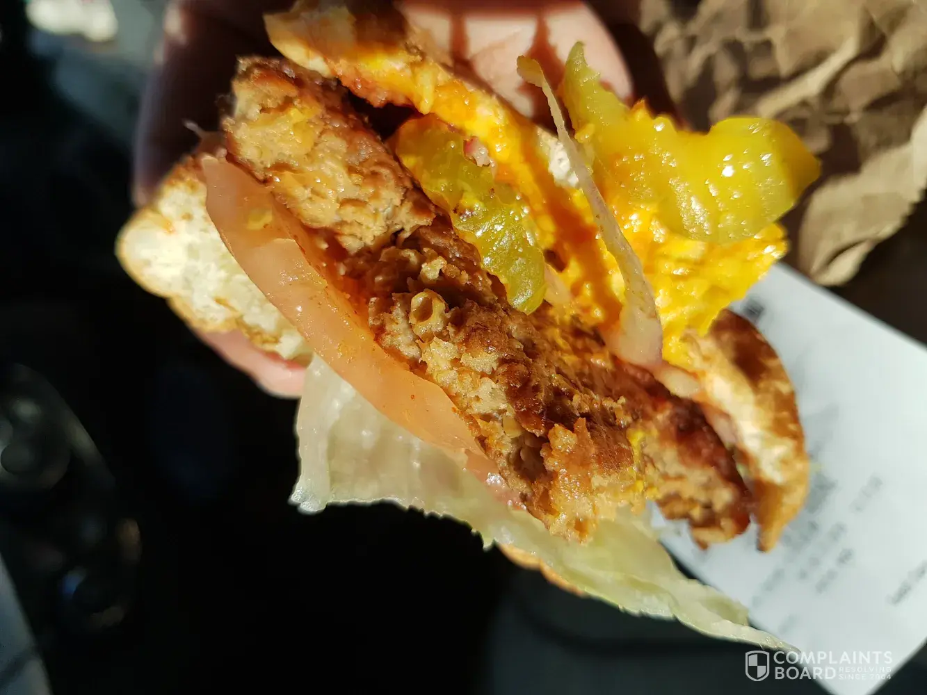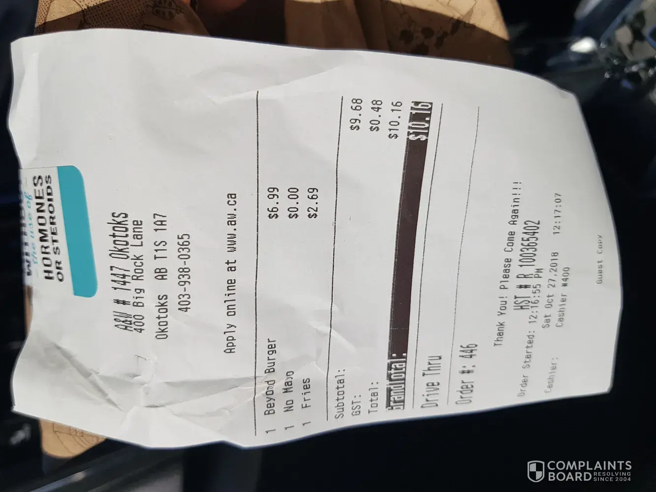 I have attached a photo of the receipt, still stapled to the bag, and of the partially-eaten burger. I would like, at the very least, to be compensated for my meal. I would still like to give the Beyond Meat burger a try, and promise to check my order before I leave!