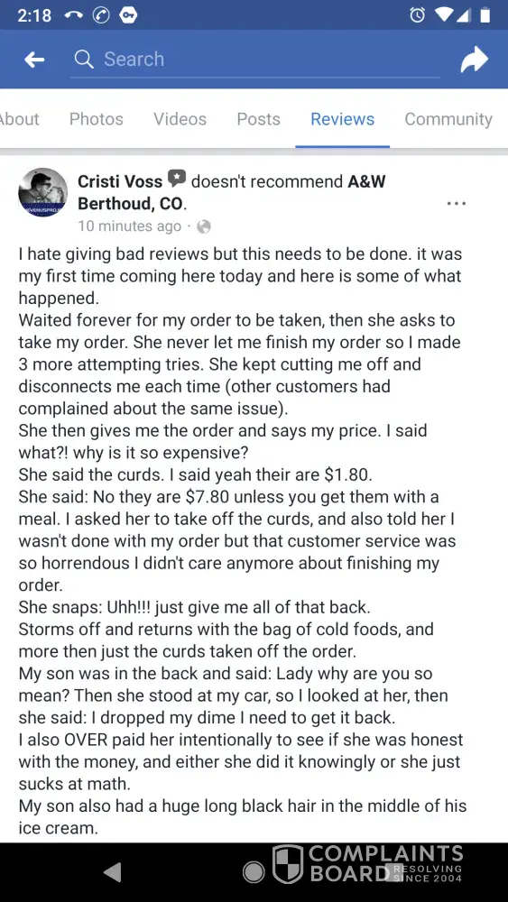 On Sunday afternoon I was at the A&W with my son and I order chicken strips, also asked to make it into a meal . I also order other foods with that its cost me $13.78 I went to sit down and saw i got only 2 chicken strips, so walked back and said i should be getting 3 chicken stripes, and the order taker was Karen as well a supervisor. She was talking to me very rude saying that I should pay for another chicken strip, and embarrassed me in front of so many people . And she was asking me to pay for another one.