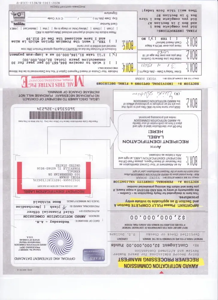 I have been receiving these scams by mail claiming I'm a winner of $1, 000, 000 or more over the past couple of months. I have NOT returned any of them, but they keep coming. The envelope usually has the following return address: International Award Payment Center -OR- North American Award Center, 1401 Armour Road, North Kansas City, MO 64116. However, the latest one I received came from a different address: Stimulus & Citizens Relief Plan Offices of Administration and Processing Services Documents Approval Commission Unanimous, P.O. Box 2905, Kansas City, KS 110-2905 On this latest document, there is a Sequential Identification# they said was issued in my name and need confirmation in 7 days.