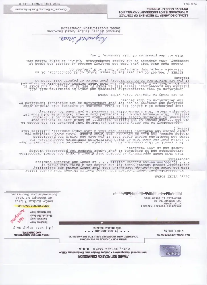I received a letter stating that I have won 2, 000000 only to find out it is false almost wiped my sacking out because I believed it now I'm broke and in debt and no money to be had it's time these scammers be brought to justice for all their mischief they have brought to ppls lives