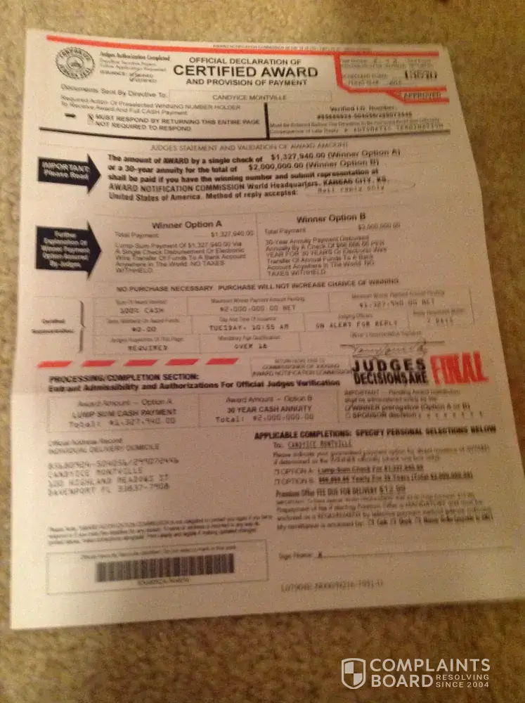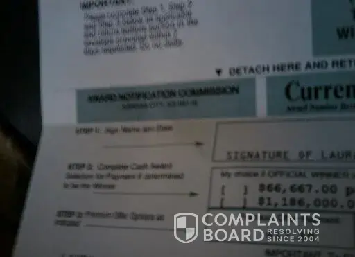 This company contacted me via mail claiming I won 2 million dollars I had the option to pay a premium offer of $11.95. Since there is no purchase necessary and a purchase does not increase your chance of winning stated on the paperwork that I still have, I mailed the paper back to them. A week later they said without the check the 2 million dollar offer will be void so I sent the check. Now I have another letter stating the same but wanting my signature and $17.89. Don't fall into this scam. You can contact me s at [protected]@gmail.com