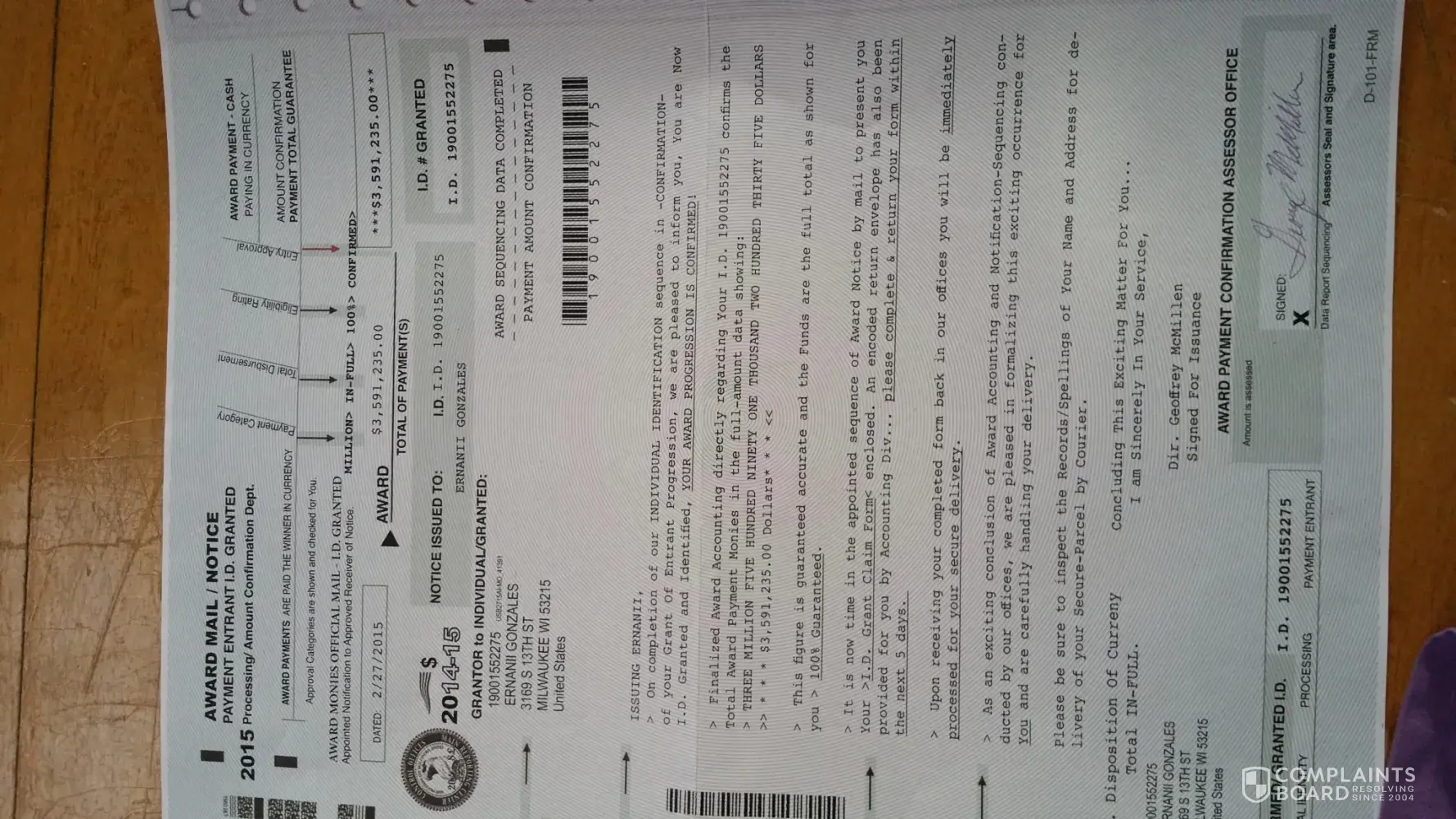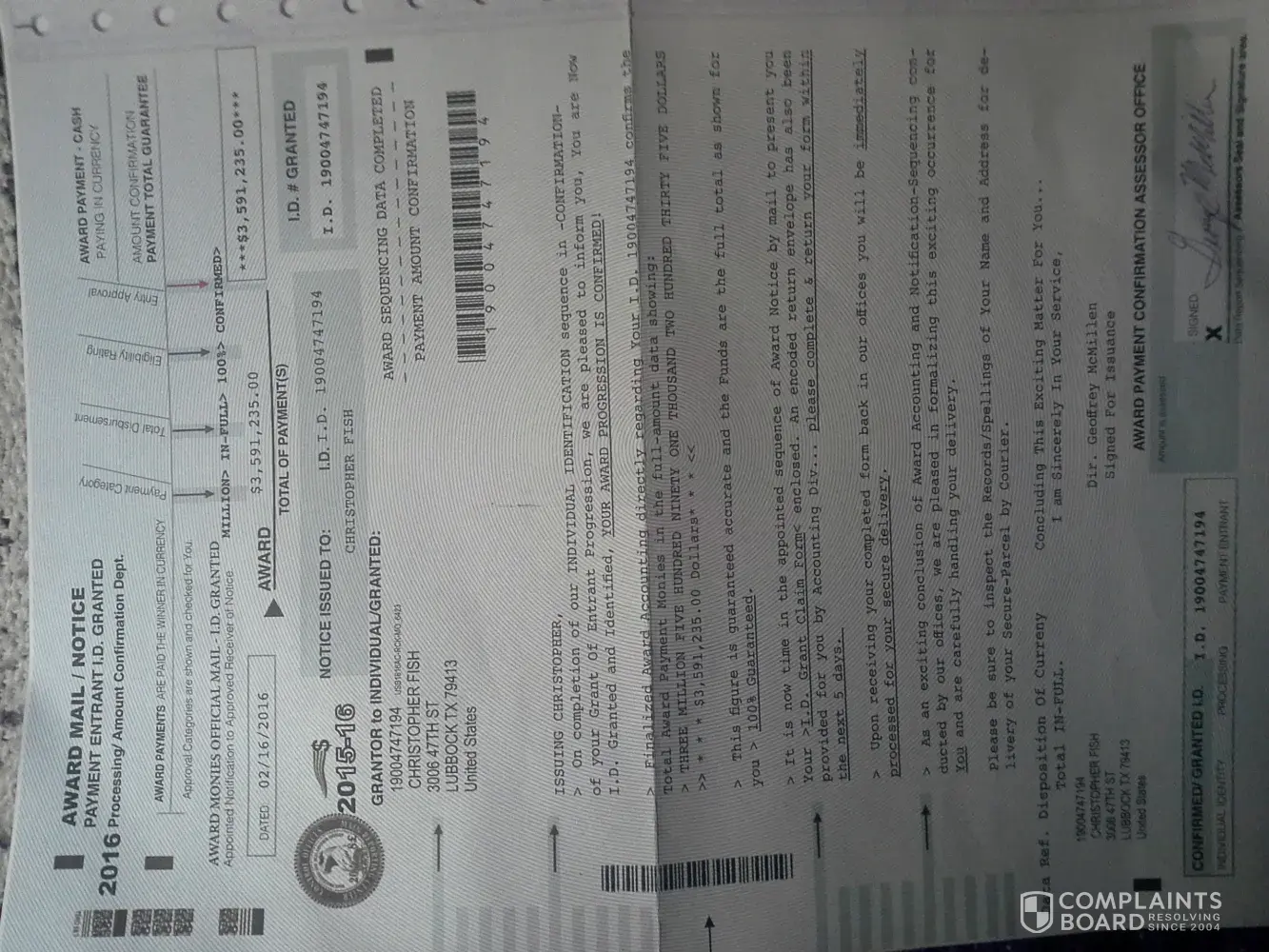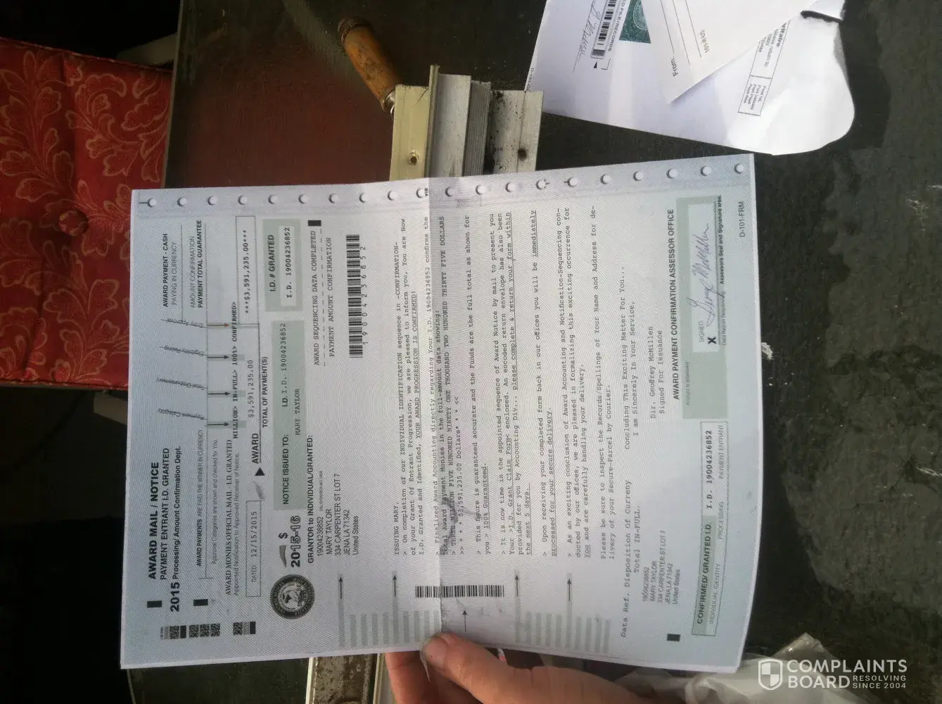 My roommate recieved a letter very similar to the ones described from a Award Processing Center in a PedEx envelope. It requested a $20.00 processing fee and the return of the certificate sent, which was identical to the one shown in the photos above. The award amount was also for $3, 591, 236.00. I typed the amount from memory so I could be off by a few digits. However, it is the exact same amount that another complaint for a ficticious < 3 million dollar award.