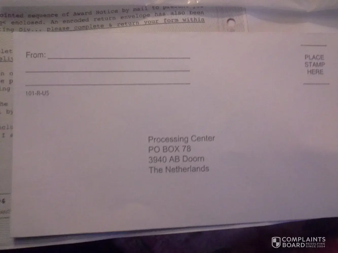 I have received the same kind of document in the mail it was delivered by fedex it came from the processing center in the Netherlands The label international an domestic. I live in north bangor new York I even have one from Kansas City the road address is spelled wrong on both documents U can reach me at my email address gghohol@yahoo.com