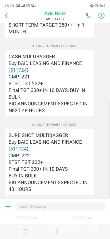 This is to inform you that axis bank is sending Fraud sms to his customer regarding share market "I got a sms on 30/10/18 and 31/10/18 that big announcement is coming in 'Baid leasing and Finance company ltd' in next 48 hrs repeatedly but noting came in next its a kind of trap because just after buying it started decreasing and can, t be sold.