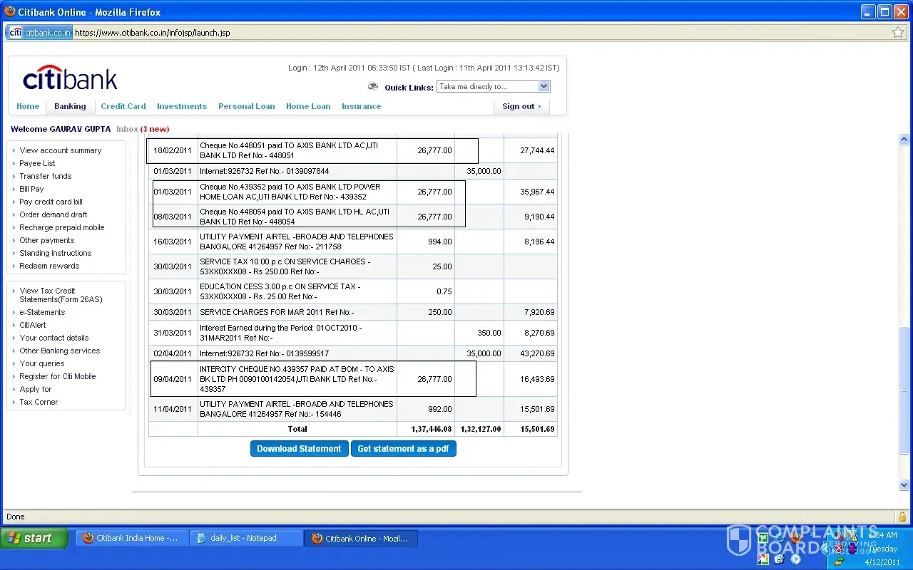 Also attached a snapshot of my citibank statement (For feb, march and april 2011).