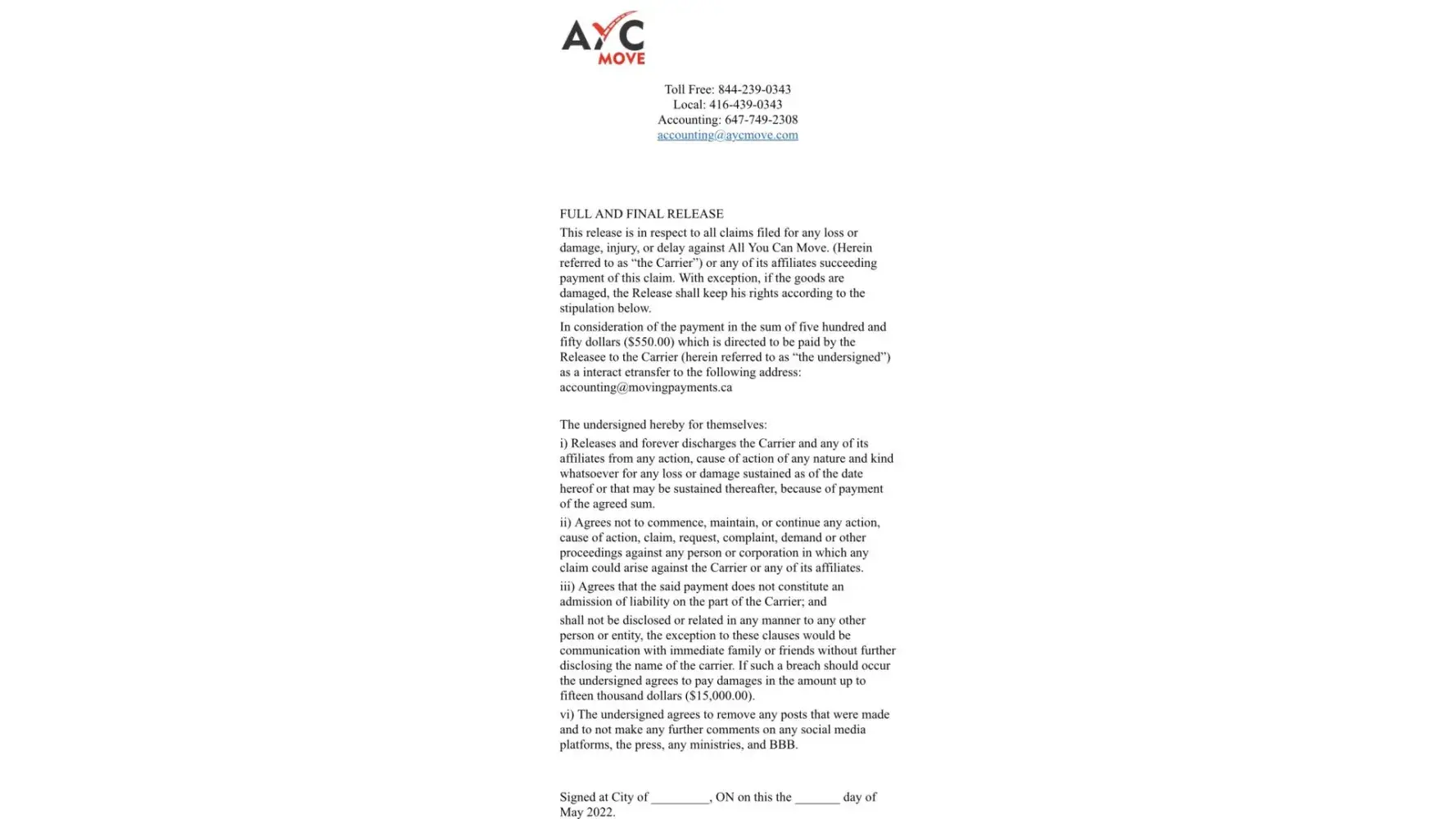 AYC's latest move is asking my nephew to sign an NDA so he can't write any negative reviews AND still pay more than what he was originally quoted to deliver his belongings. They are blaming a subcontractor they "had no idea had such a bad reputation". It is all LIES. They have been taken to court and lost. The two owners (human POS) Cemal Ozturk and Dogan Celik drive around in their luxury cars purchased with money earned by bilking innocent people out of their hard earned money. Any contract signed once your belongings are on the truck is under duress, voiding the contract. Report them to the BBB and Ministry of govt and consumer services.
