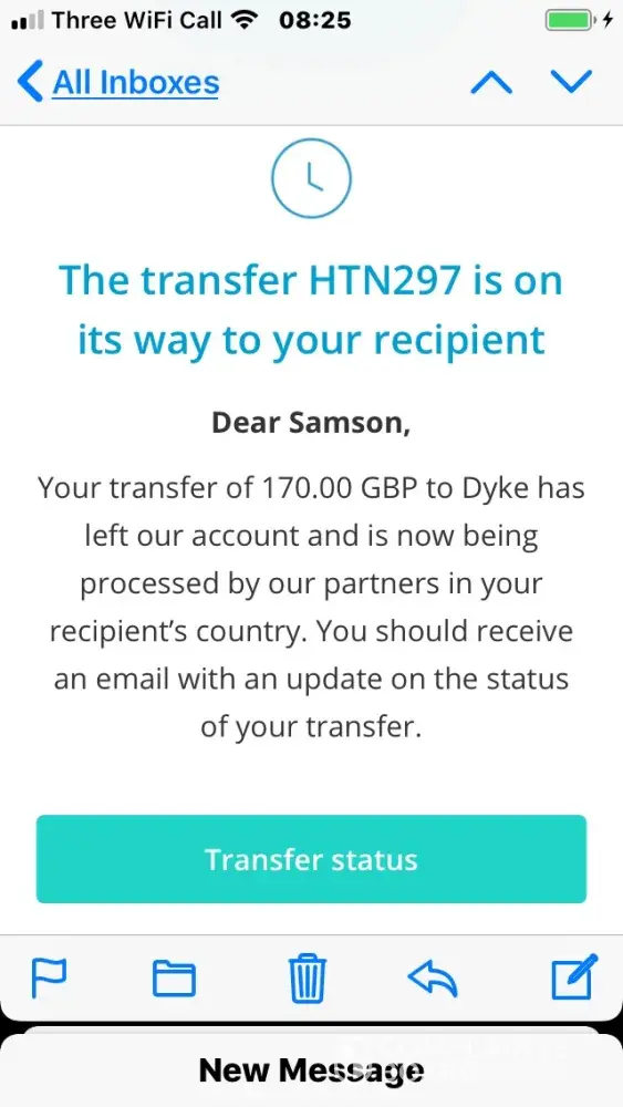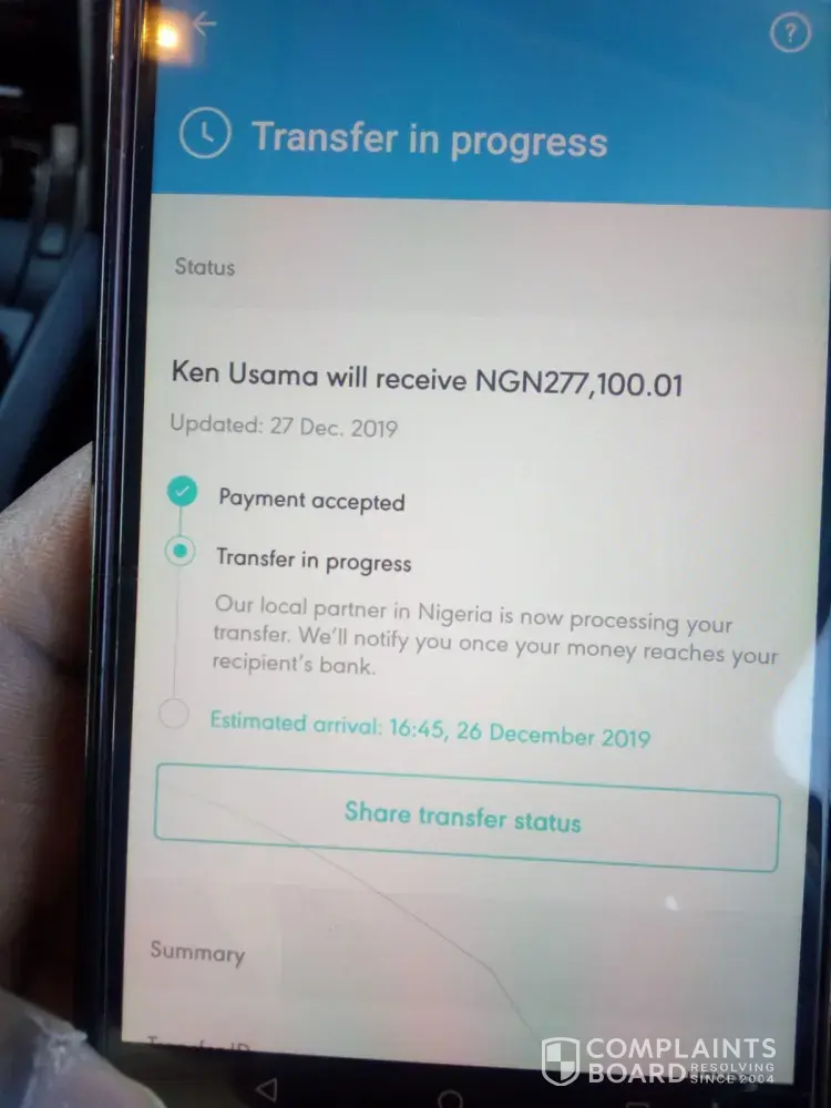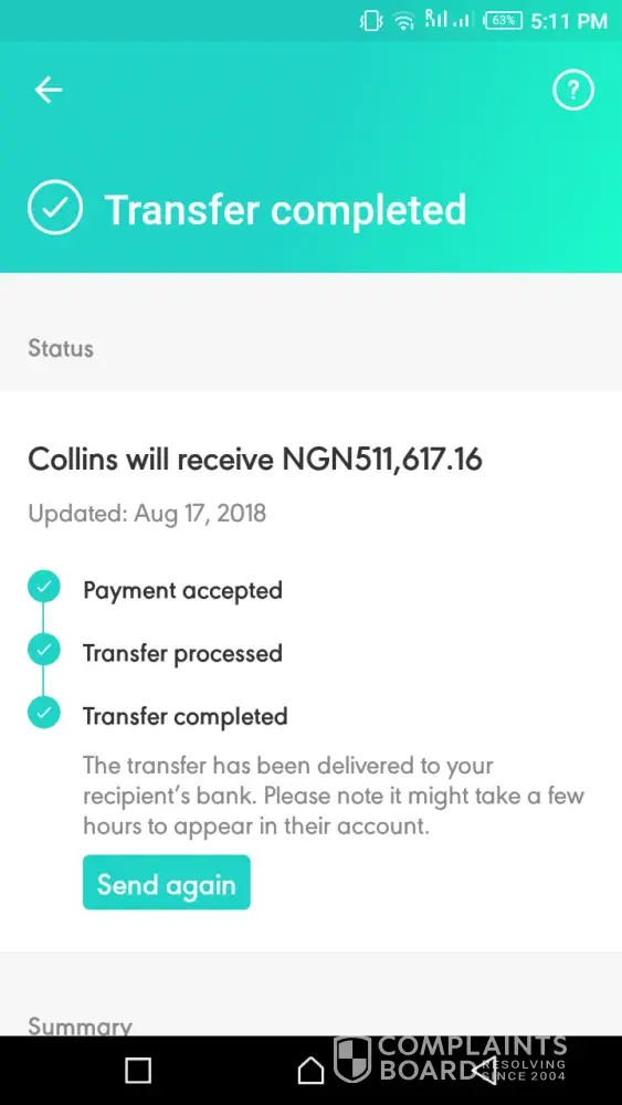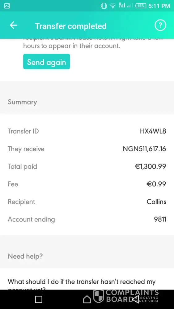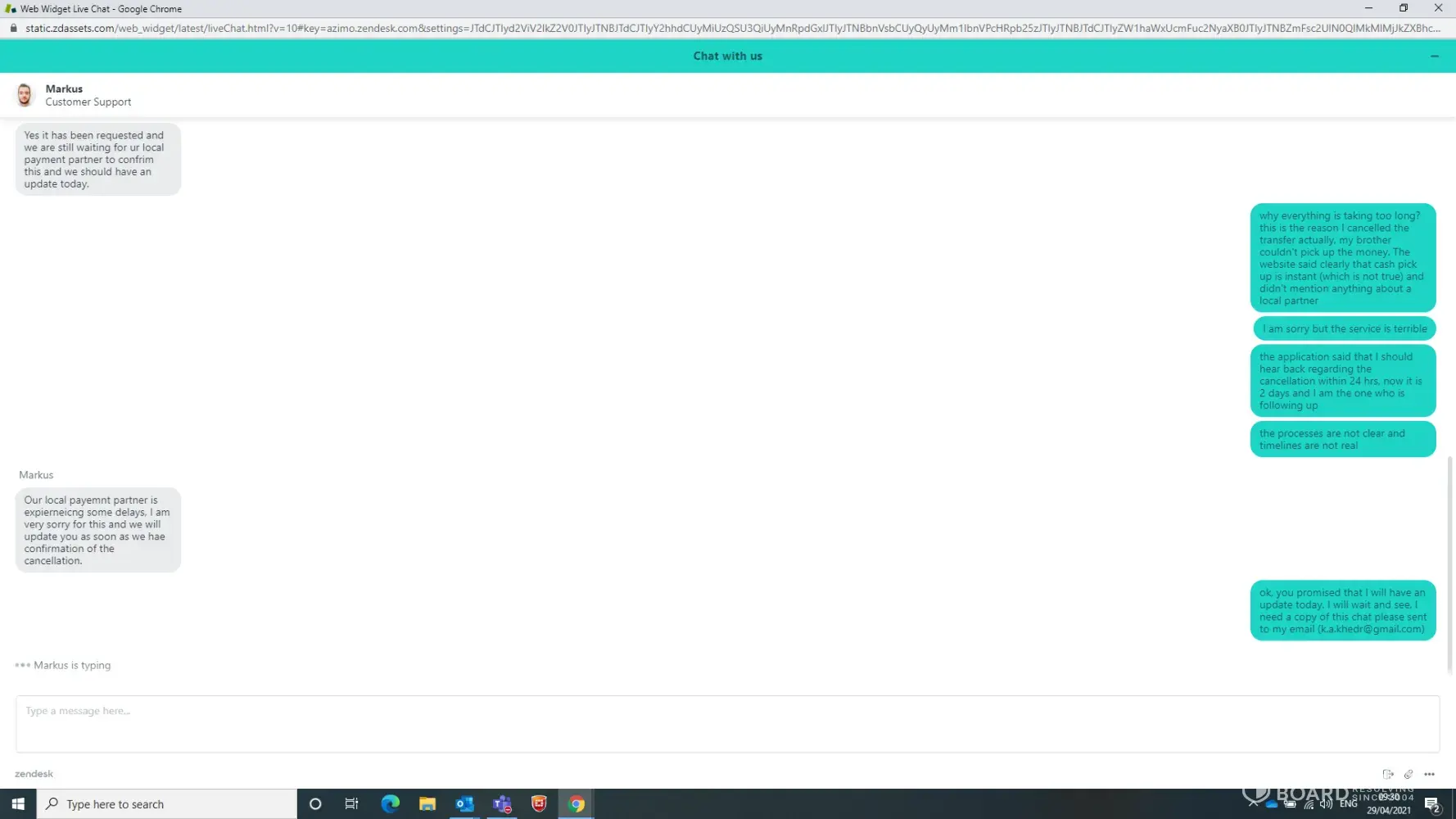 2. I checked on the same day (27th April) with Azimo's customer service via web-chat, and I was advised that there is a delay from the local partner. When I made the transfer it was not clear that there is a local partner or that it won't be instant as promised. Due to this, I requested to cancel the transfer