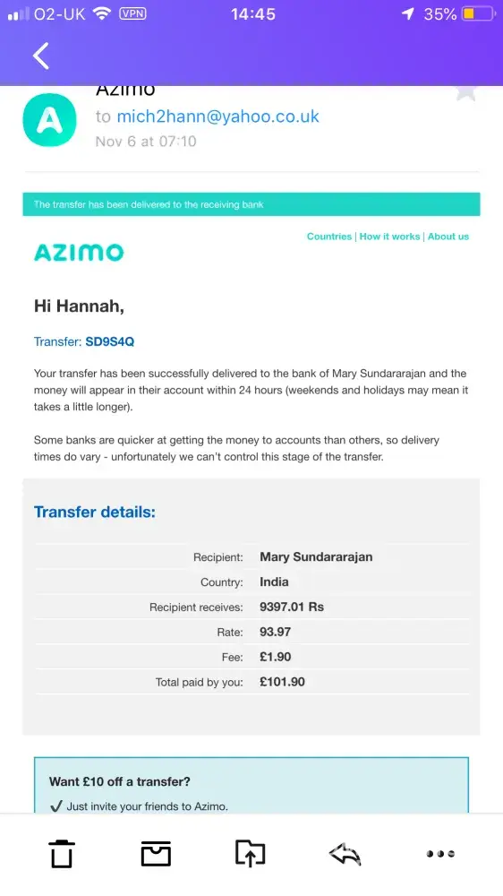 I travelled from India on 05/11/18. I got an email from azimo stating that my transfer of £ 102 was successful and my mom Mrs. Mary Sundararajan has received. I was so shocked. They checked my moms account. She has still not received it until 09/11/18. My worry how money can get transferred without my acknowledgment? Bank shows that azimo has taken £ 102 from my account. Not happy at all. I need an update as soon as possible