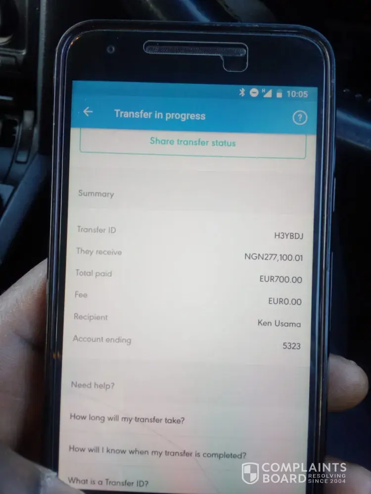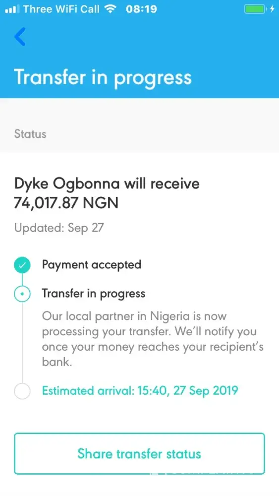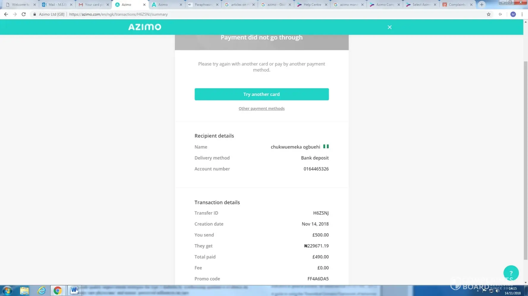 On the 13 March 2019, I transfer of a total sum of three hundred pounds from my Nationwide Account Number [protected] into Azimo Ltd Account. As it were the transaction was not completed and as consequences the Naira equivalent was never paid into my UBA Account in Nigeria.