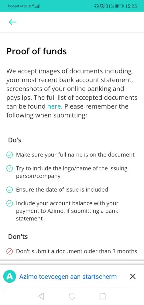 Azimo is ridiculous, I highly recommend you send money with any alternative available even though the rate could be worst. What Azimo will do is, be good at your 2 first sent, and Devil from that on, every month they will receive your money very easily, and after taking it out of your account, they will hold that for a while. Even though you already sent them your source of funds, they will ask you again, and again, and the same proof of funds sent last month (Payslip) with the income of 3500 and e Azimo outcome of 1800, they will come up after few days saying prood rejected, insufficient funds. For me never again, this is a Big Mafia, last month was a nightmare, after solving it, I asked if they will ask again this "source of funds" they return an email saying "No, you provided it, so that's enough for us" nevertheless this month another nightmare, even worst now, my payslip with the income of the numbers above, is not suffucient, they will hold that for a while, work with my money, and while they are playing around, the money I sent to support my sister with my mother in bed will not arrive.