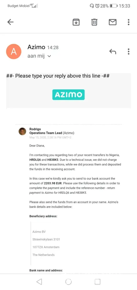My name is Diana. Azimo has details of my bank account and which bank it is. Mu documents were rejected and still is. That means I can't pay anyone money. But they still transferd money but from a different bank. I never had and never will have a bank account of rabo bank. My bank is ing and it stays like that. They transferd money from rabo bank 2200 euro. I never confirmed payment of my bank because I couldn't because documents are rejected and still is rejected. From ideal they payed a man from rabo bank. I contacted rabo Bank and they say it's the fault of ideal and there are no consequences for me. In my eyes because they transferd money without permission from rabo bank they made a mistake. And ideal made a mistake. You will never have 2200 euro. It's not my mistake.