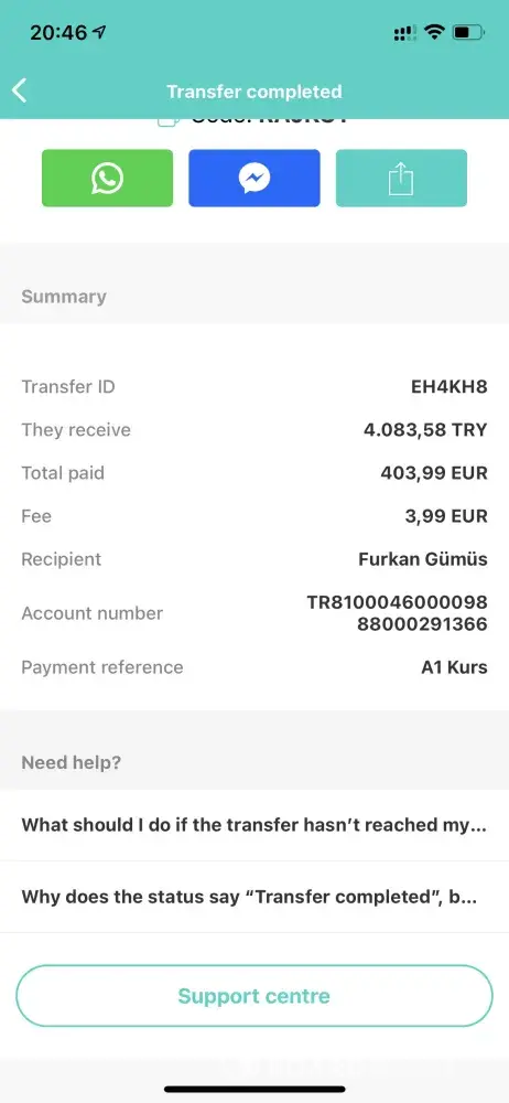 Desired outcome: I want my money back since they seem unable to get a feedback from their partner in Turkey and also unable to deposit the money into my friend’s account there.