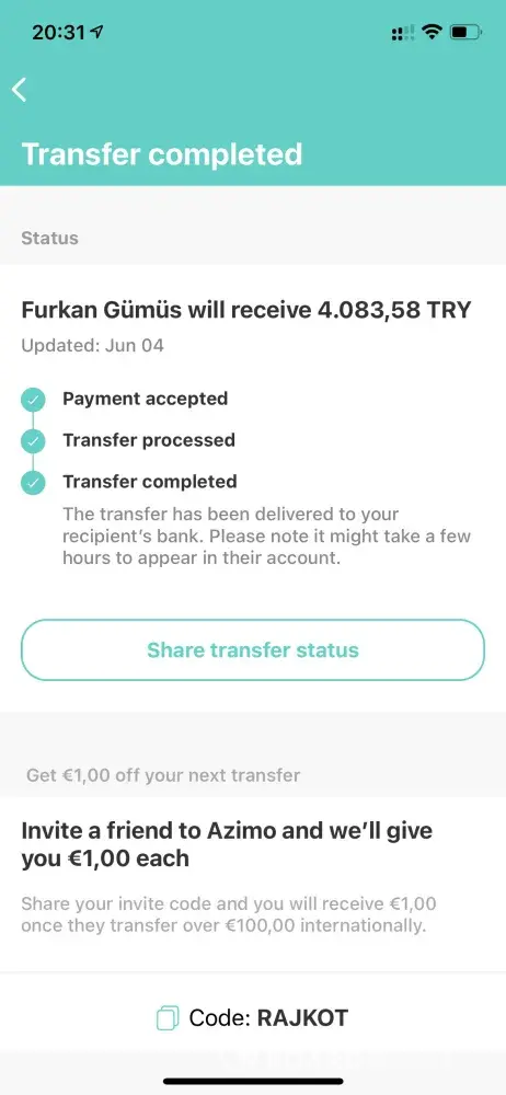 I have sent money to my friend's bank account in Turkey on 4th of June. I received the message that transfer was completed. The next evening I received an email from Azimo to provide more details what the money is for and also an ID copy of the recipient, which I did right away.