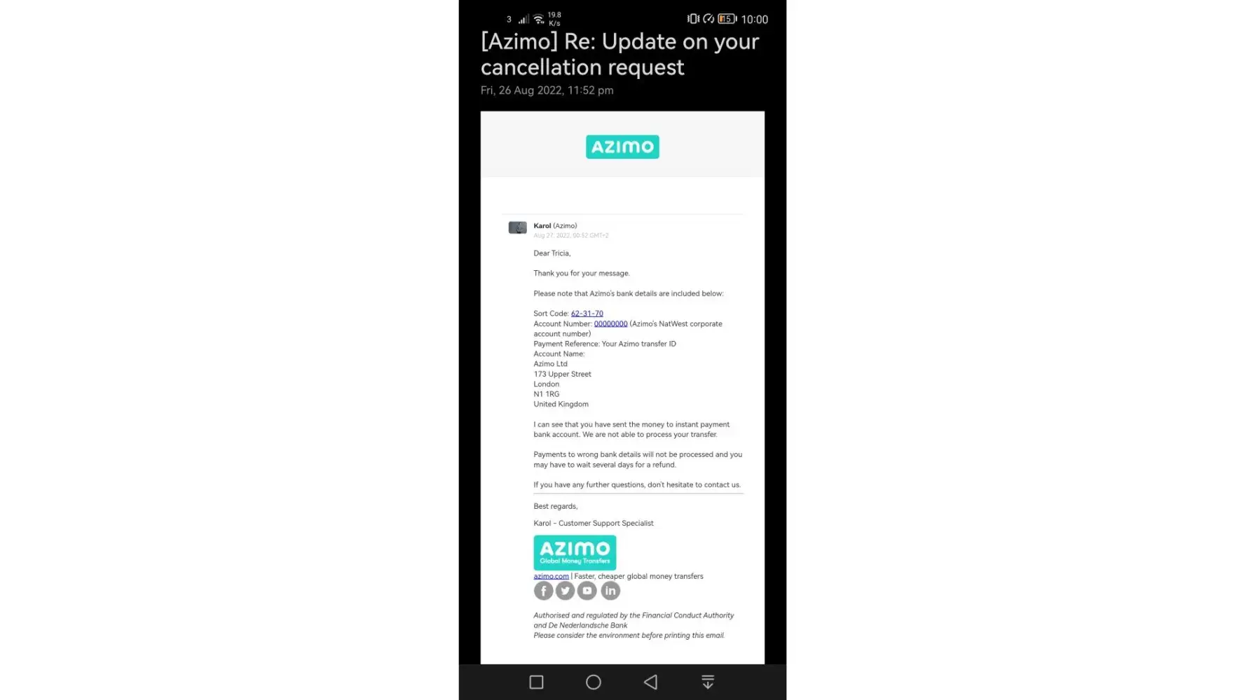 I processed a transfer through Azimo last 25th of August and the recepient is my mom. I proceed to send the money from my Revolut account to the Azimo account number: ‪[protected]‬ and sort code ‪04-00-72‬. It was 620 pounds under my name: Tricia Marie Abanto Teleron from Revolut. It was deducted immediately in my Revolut account. Iy got so delayed and so I canceled it. It was officially canceled by them last 30th of August. I emailed them multiple times to process my refund. Apparently, they said I sent the money in their instant payment bank account and eas not processed so they will refund it to me. But they are either unresponsive or vague about it. No one to directly contact to because they have no live chat or number to call. Please se attached files for reference and evidence.