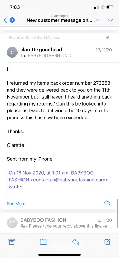 I have emailed and tried to get in contact with someone several times and still yet to hear anything about my return. I'm also a big fan of babyboo products however after this experience I don't think I will shop here again. I've sent back 4 dresses that I didn't like I'm
