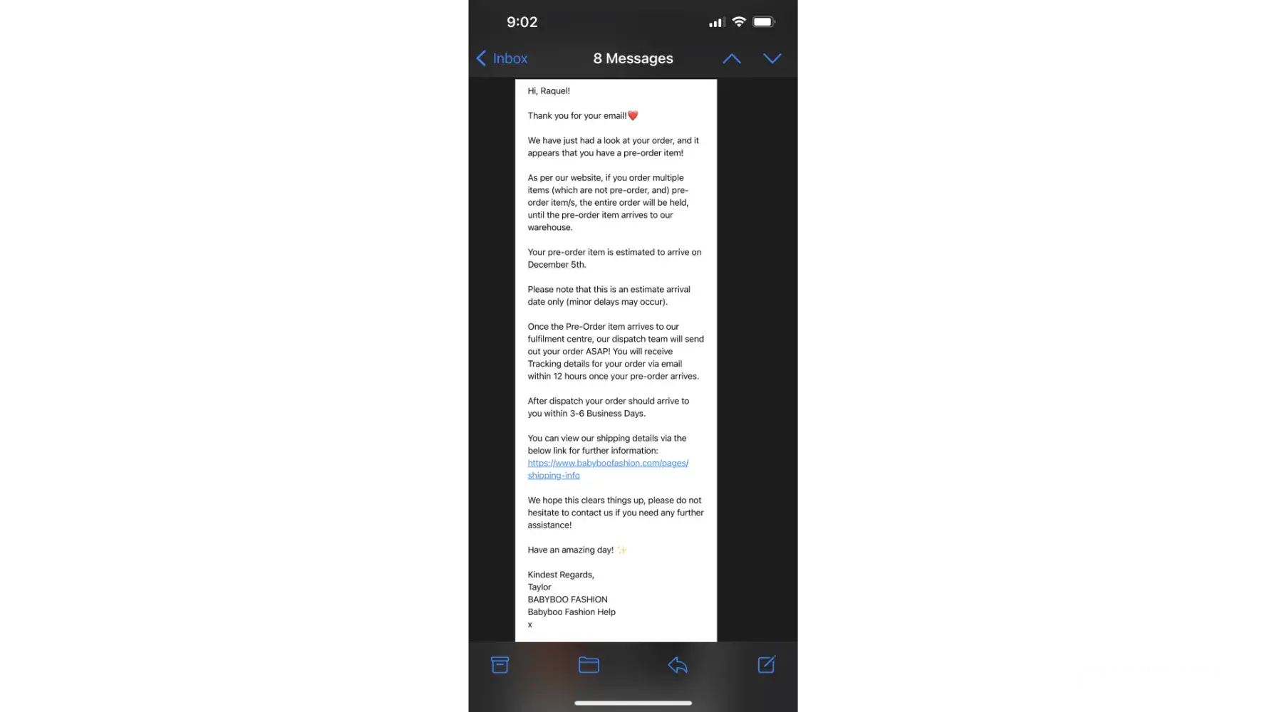 Unfortunately I order 2 dresses and was deemed to be lost in transit and was advised by AusPost to contact the merchant to organise a refund and if I provided the reference number - it will be rectified quickly as the merchant has a contract with AusPost to have a turnaround within 48hrs. It's now almost the end of Nov and have reached out to babyboo several times with no response at all and then eventually advised they need AusPost to say in writing that the item is lost which is not protocol AT ALL nor AusPost do this as part of their procedures for any lost items. I've relayed this information and yet again no response.