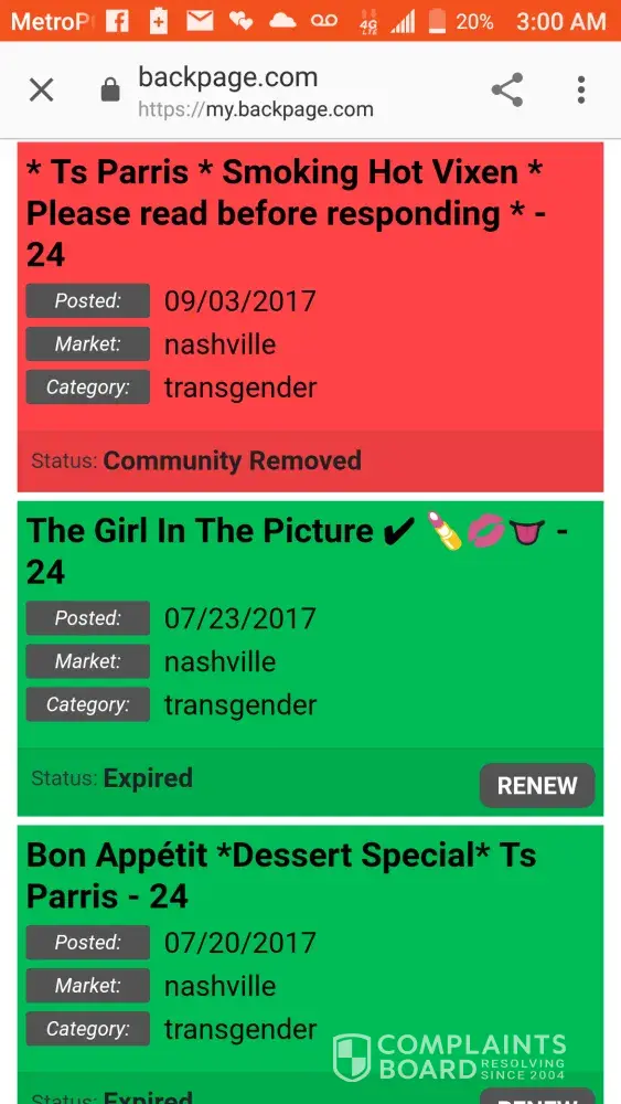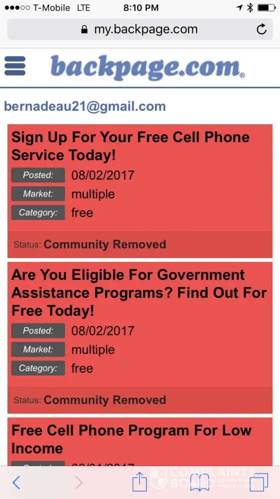 Im sick of paying for an ad on backpage that is community removed 10-15 minutes later. I've seen backpage numerous of emails left messages with not even a single reply. I've been posting on there for almost 2-3 years. I've paid money like any other person but they still accept the money and have the nerve to take it down without an explanation when i in fact post under their guidelines. This has been happening since the beginning of july and still going on. I am more then upset