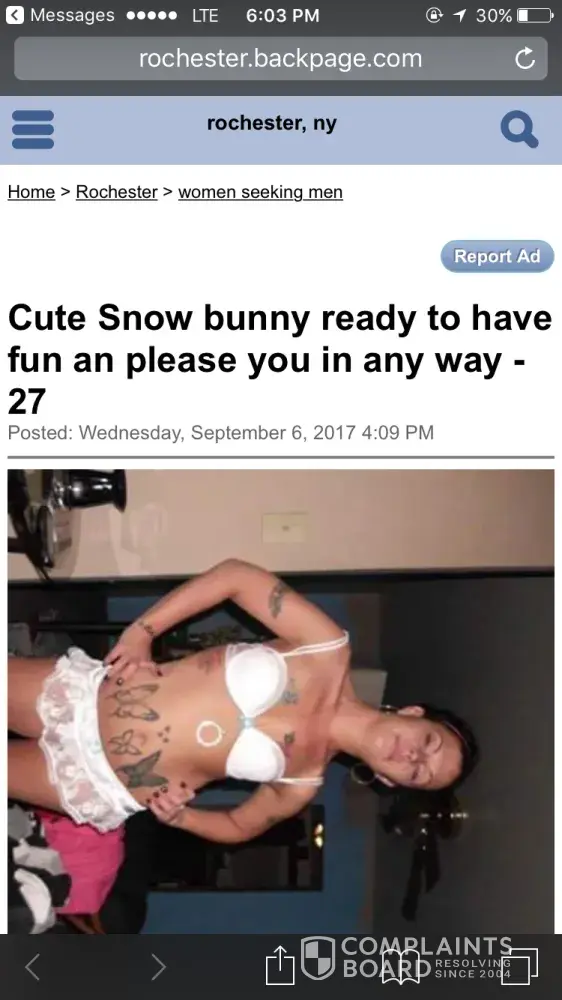 Be forced to report it to the authorities and lodge a formal complaint since you don't see it fit to check before things are posted and have no way to contact you to report a problem. Fix this immediately. http://rochester.backpage.com/WomenSeekMen/cute-snow-bunny-ready-to-have-fun-an-please-you-in-any-way/30603253