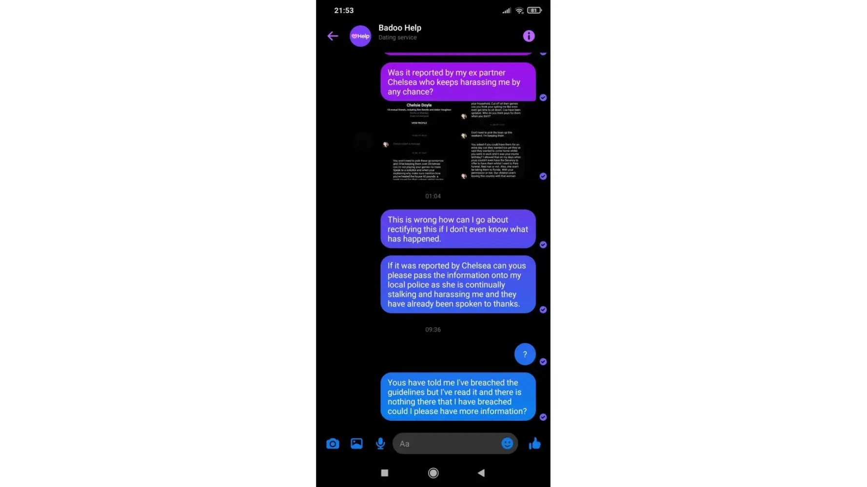 I’ve been informed that someone going by the name of Chelsea, has been using my pictures for their badoo account. I recieved a video message from a user of your app that I happen to have as a friend on Facebook, showing me a quick glance of the conversation between the two and my images in which make up their account but is in fact not their face, but mines. I was informed of the circumstances by a man named Andrew Woods 2pm Saturday evening. I am able to attach below the screenrecording in which Mr Woods sent me.