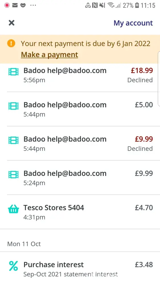On my debit card I get with draws from "Badoo 50 California St 15th Fsan Franciscocaus" even though my account has zero subscription to badoo every day they take 3.45 out of my account. Not only do I want all my money back but also stop charging me!